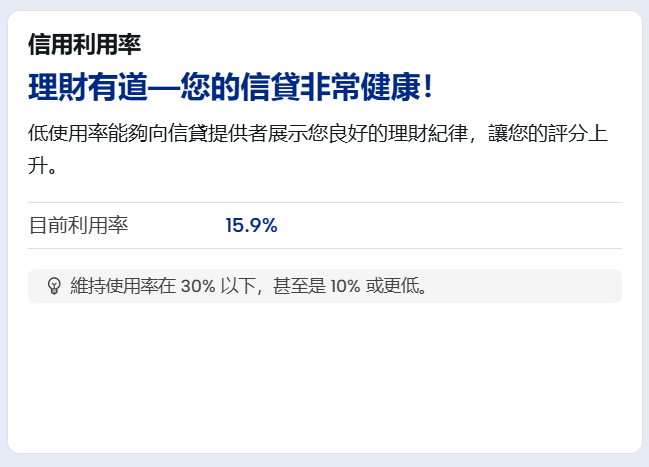- 盡量保持信貸額使用率% (總結餘/ 總信貸額) 在30%以下